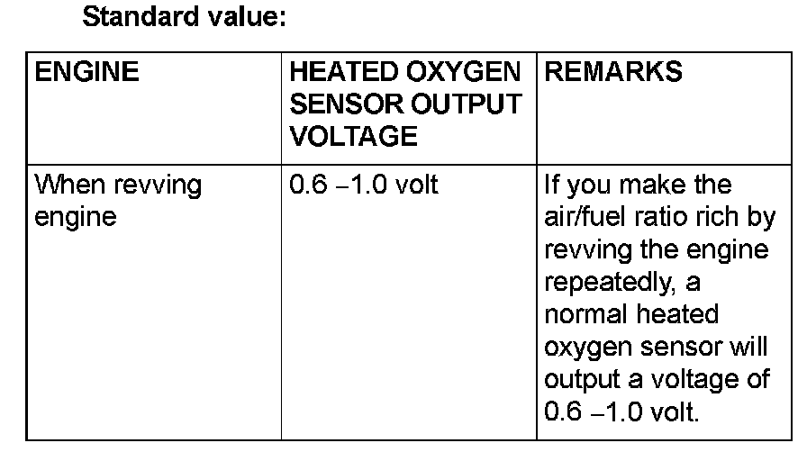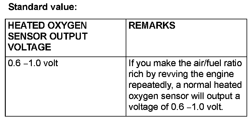 NOTE: If the sufficiently high temperature [of approximate 400 °C (752 °F) or more] is not reached although the heated oxygen sensor is normal, the output voltage would be possibly low although the rich air/fuel ratio.