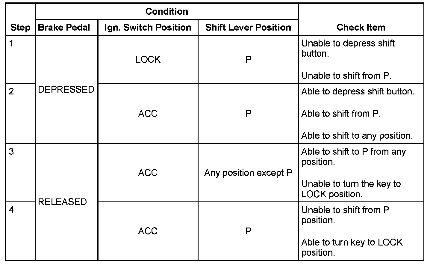 SHIFT LOCK SYSTEM FUNCTION INSPECTION