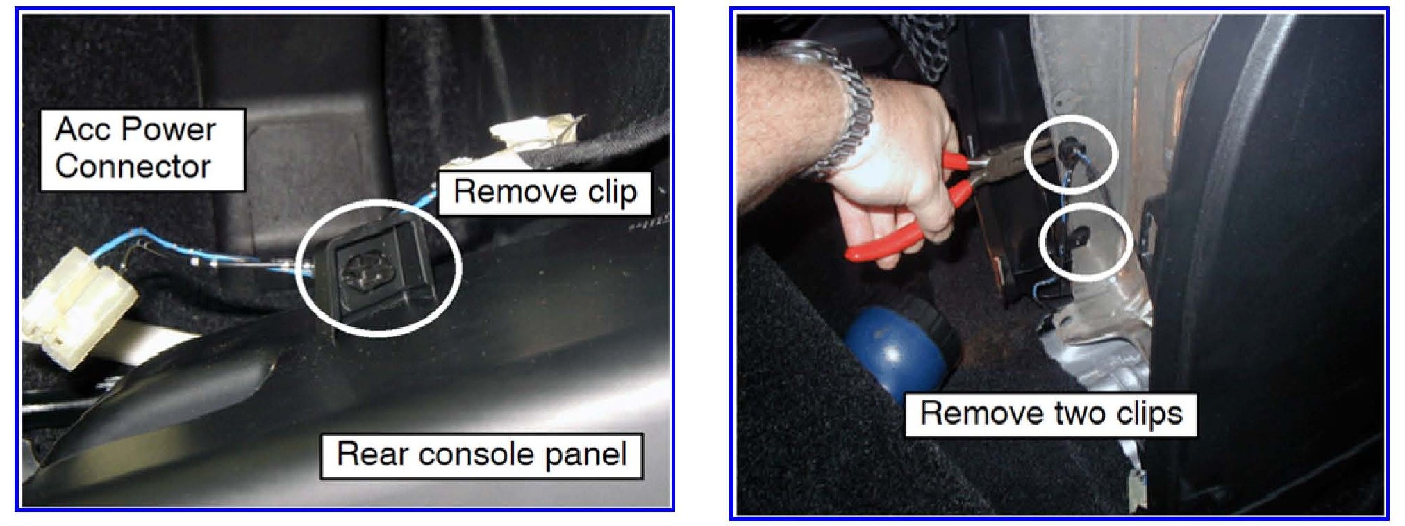 7. Disconnect the harness from the ACC (accessory) socket and rear fan (if equipped). Remove the clip securing the harness to the rear console panel and set the panel aside. Use needle-nose pliers to remove the harness from the console structure as shown.