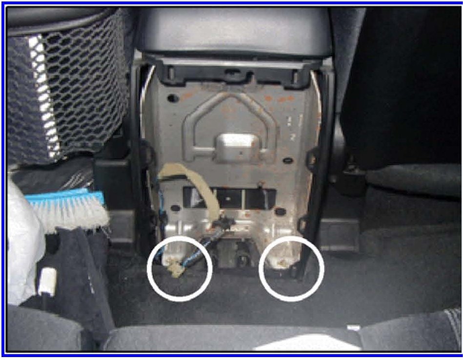8. After removing the rear panel and the harness, use a 10 mm socket to remove the two 10 mm bolts from the bottom of the floor console as shown.