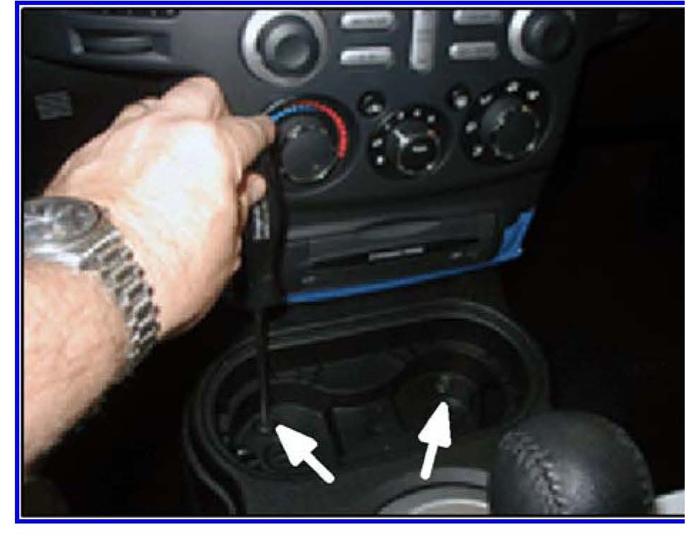 10. After removing the cup holder, remove the two front floor console retaining screws as shown.