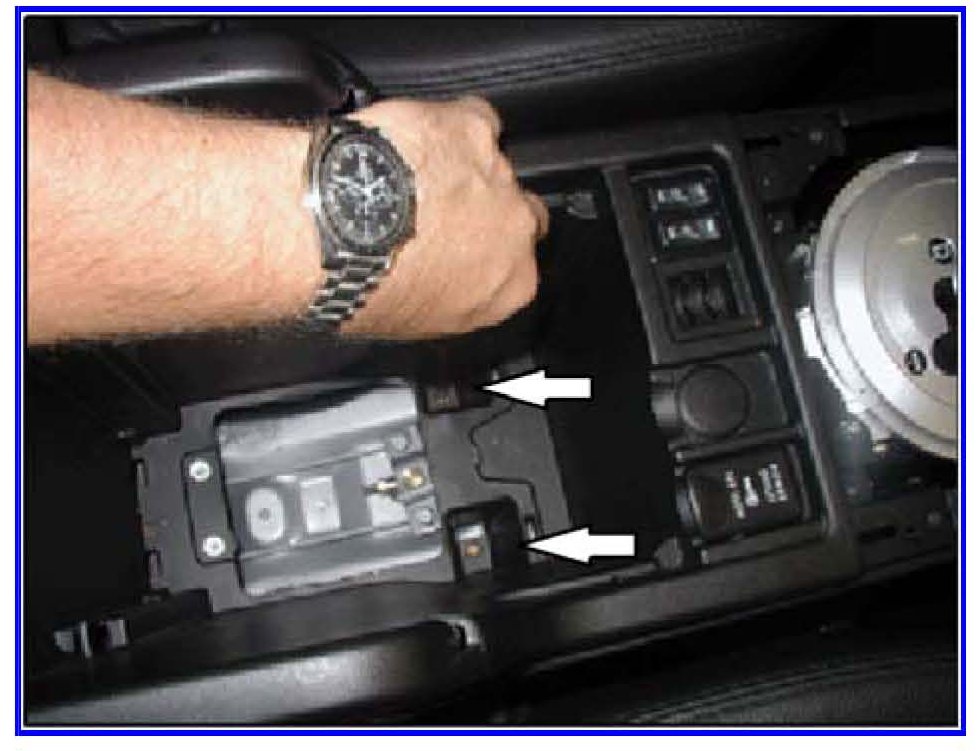 23. Lift the floor console from the front edge and rotate it up and back as shown.