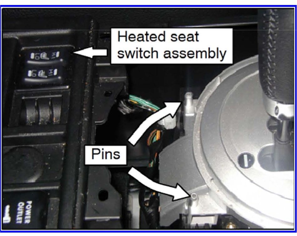 22. If the vehicle is equipped with heated seats, reach under the switch assembly and push it out of the floor console cover. Disconnect the electrical connector from the switch assembly and set the switch assembly aside.
