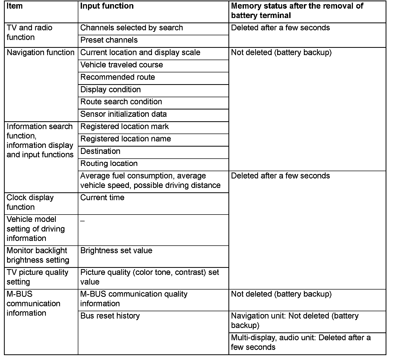 MMCS stores a large volume of information which is input at the discretion of customers. The memory of each information becomes as follows when the battery terminal is removed. Therefore, before removing the battery, the recording of preset channels is necessary. Depending on the time period of battery removal, the current location, destination, and others of the navigation function must be recorded.