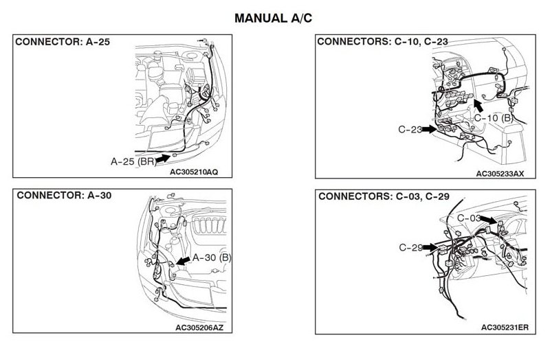 STEP 10. Check the wiring harness between A/C-ECU connector C-10 (terminals 10 and 14) and ambient air temperature sensor connector A-25 (terminals 1 and 2).