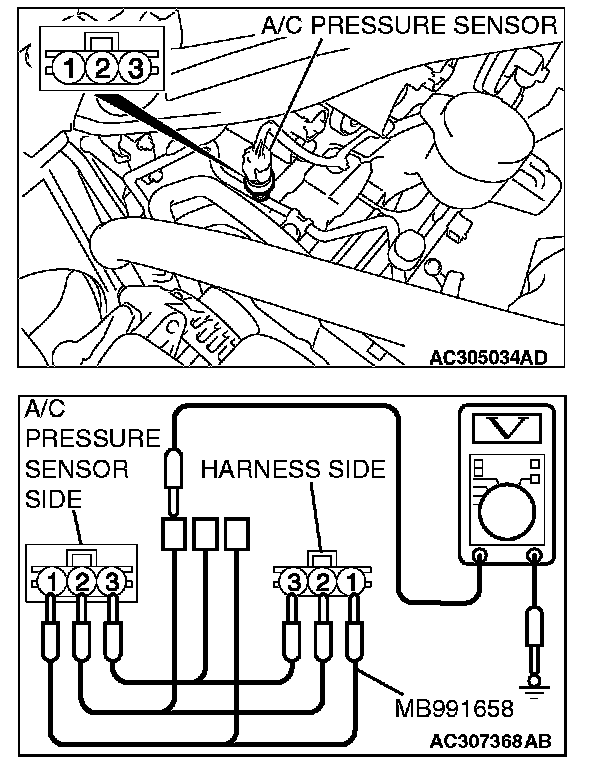 2. Disconnect the A/C pressure sensor connector and connect special tool test harness MB991658 as shown in the illustration.