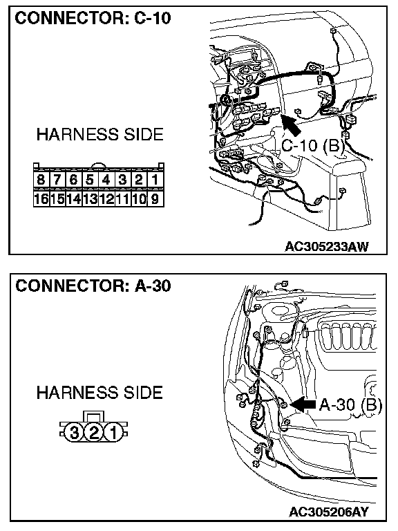 STEP 6. Check the wiring harness between A/C-ECU connector C-10 (terminals 4, 1 and 3) and A/C pressure sensor connector A-30 (terminals 2, 1 and 3).