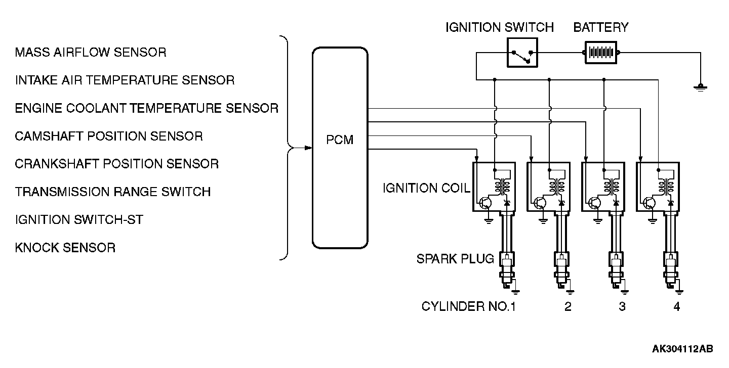 The PCM determines which ignition coil should be controlled by means of the signals from the camshaft position sensor which is incorporated in the camshaft and from the crankshaft position sensor which is incorporated in the crankshaft.