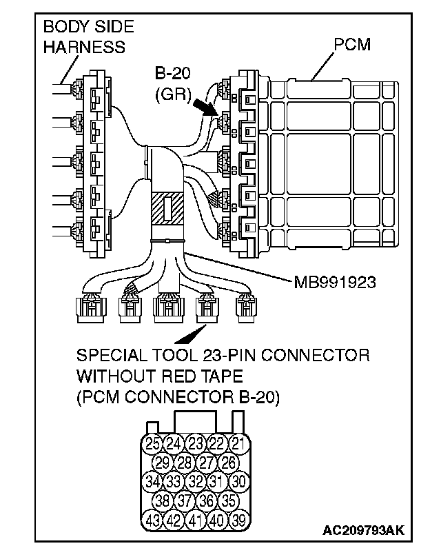 (2) Connect special tool MB991923 (check harness) between the PCM and the body-side harness connector.