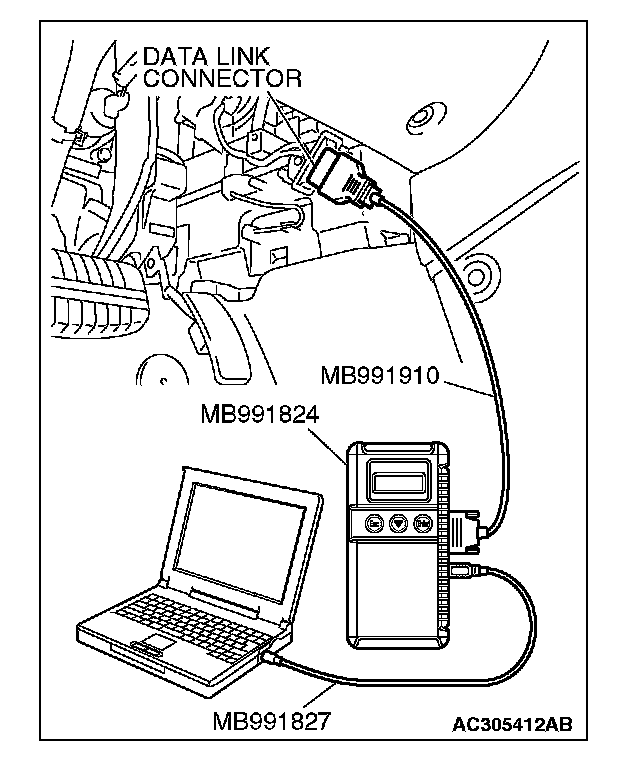 CAUTION: To prevent damage to scan tool MB991958, always turn the ignition switch to the "LOCK" (OFF) position before connecting or disconnecting scan tool MB991958.