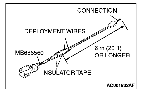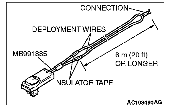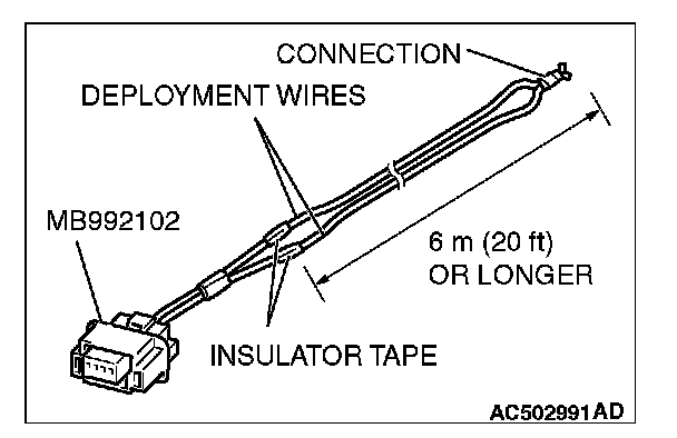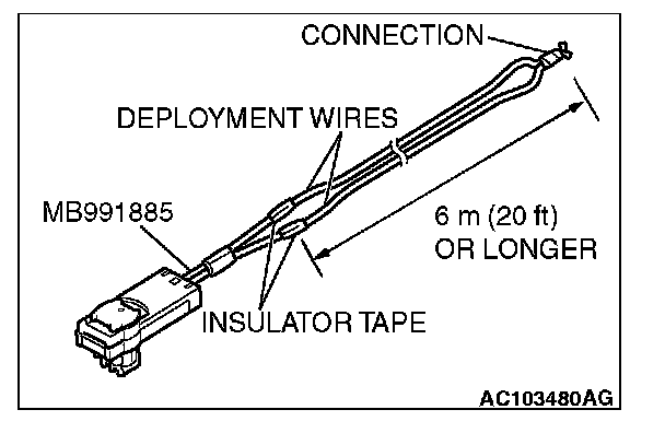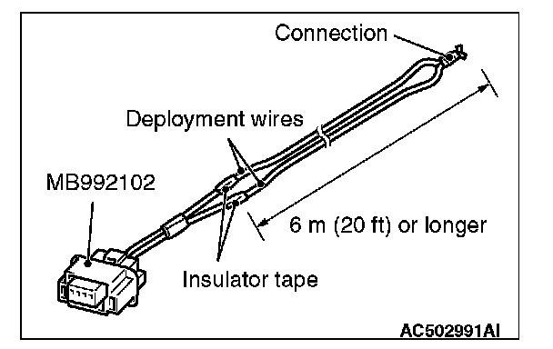5. Connect deployment wires, each 6 meters (20 feet) or longer, to the two leads of special tool adapter harness (MB991885), and cover the connections with insulator tape. The other ends of the deployment wires should be connected to each other (short-circuited), to prevent sudden unexpected deployment of the air bag module.