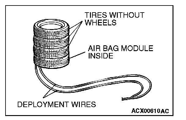 3. Connect deployment wires, each 6 meters (20 feet) or longer, to the two leads of special tool MB992102, and cover the connections with insulator tape. The other ends of the deployment wires should be connected to each other (short-circuited), to prevent sudden unexpected deployment of the air bag module.