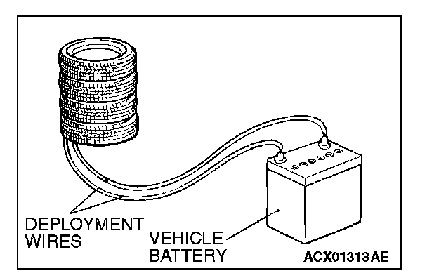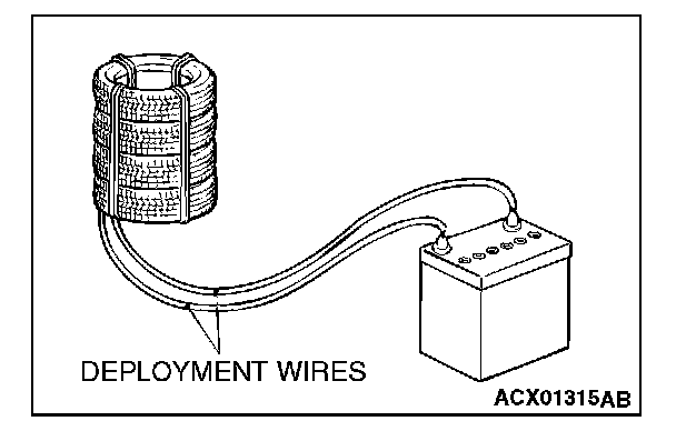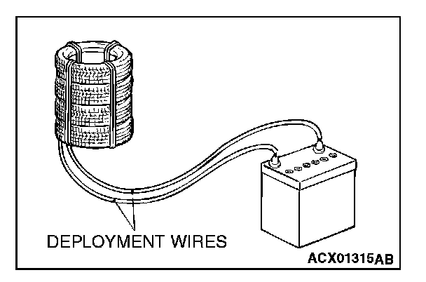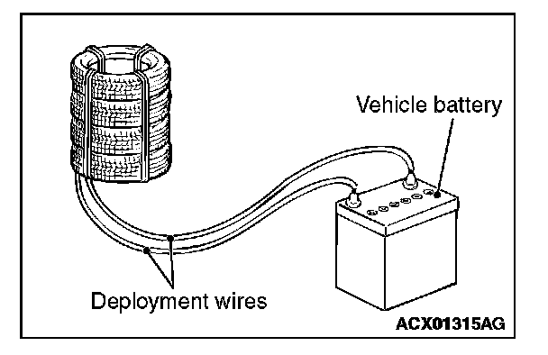 7. At a location as far away from the air bag module as possible, and from a shielded position, disconnect the two connected wires from each other, and connect them to the two terminals of the battery (which has been removed from the vehicle) to deploy the air bag.
