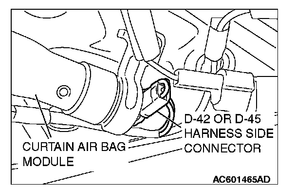 3. Disconnect harness side connector D-42 or D-45 (two-pin, black) from the curtain air bag module.