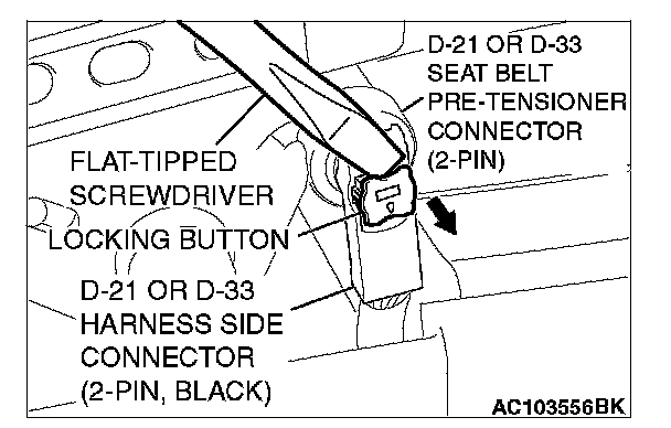 1. Use a flat-tip screwdriver to unlock the harness side connector (two-pin, black) locking button by withdrawing it toward you in two stages.