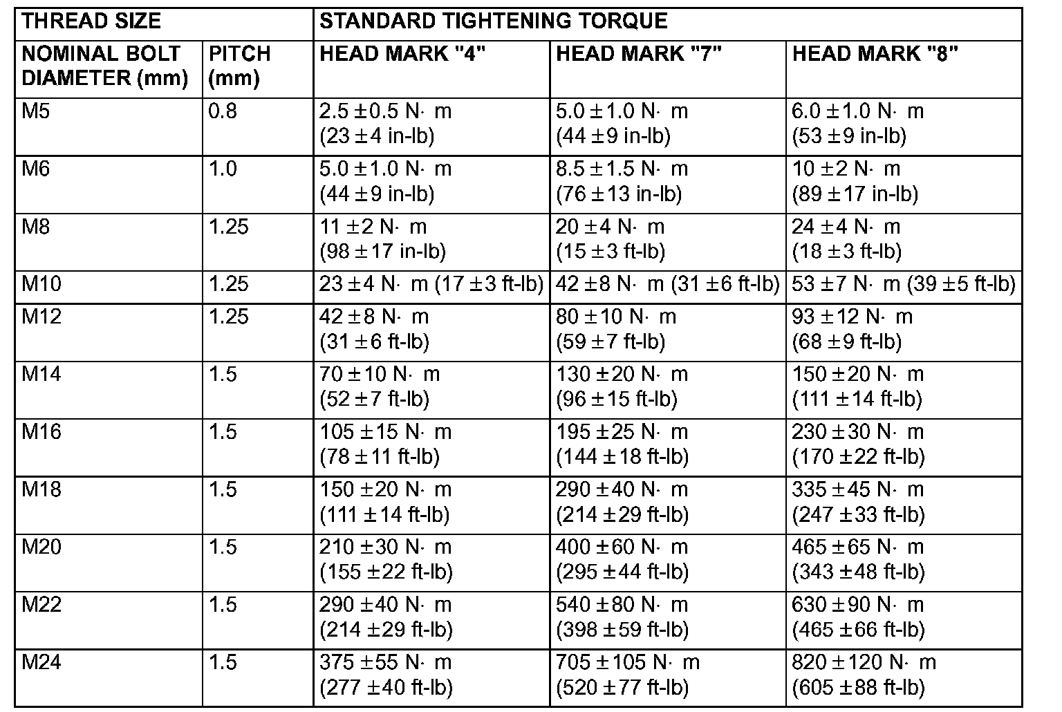 STANDARD BOLT AND NUT TIGHTENING TORQUE