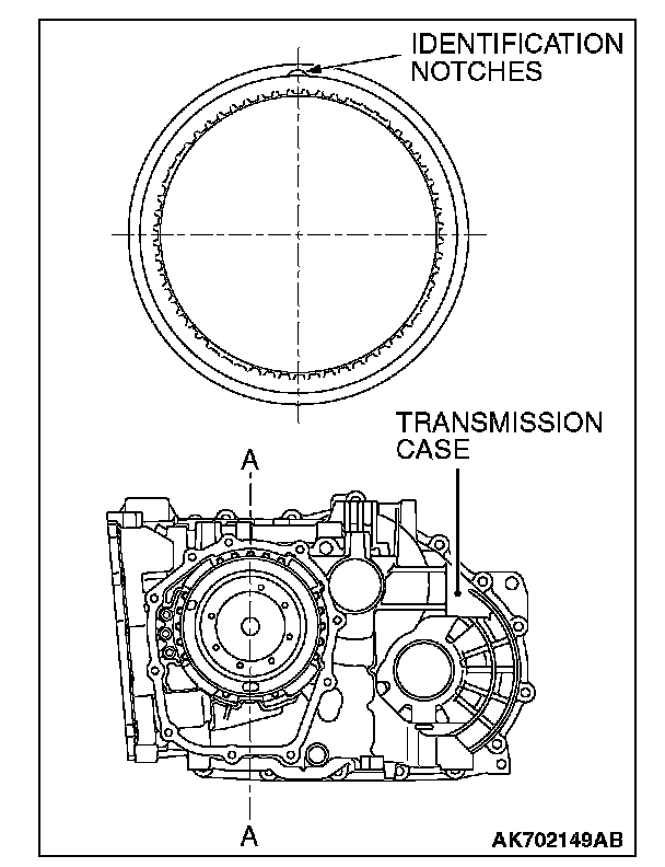 5. Check where the identification notches of the one-way clutch inner race are. Install the one-way clutch inner race to the transfer drive gear bearing so that either of the identification notches can be located on the line A - A.