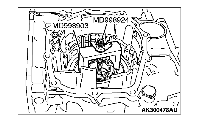 7. Set special tools MD998903 and MD998924 as shown, and then compress the one-way clutch inner race and install the snap ring.