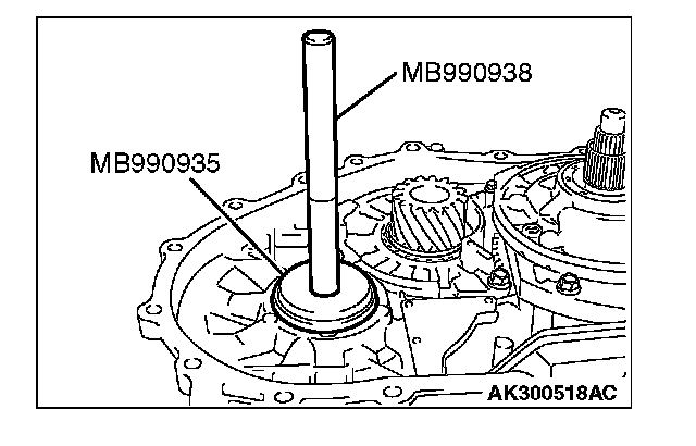 65. Use special tools MB990935 and MB990938 to tap the differential bearing outer race in the transaxle case.