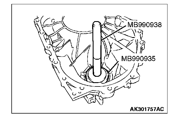 69. Use special tools MB990935 and MB990938 to press the differential bearing outer race into the torque converter housing.