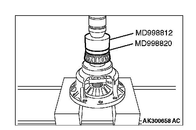 Using special tools MD998812 and MD998820, press in the taper roller bearing.
