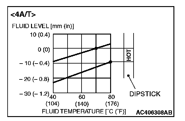 12. Drive the vehicle until the transmission fluid temperature rises to the normal operating temperature [70 - 80°C (158 - 176°F)], and then check the transmission fluid level again. The transmission fluid level must be at the "HOT" mark.