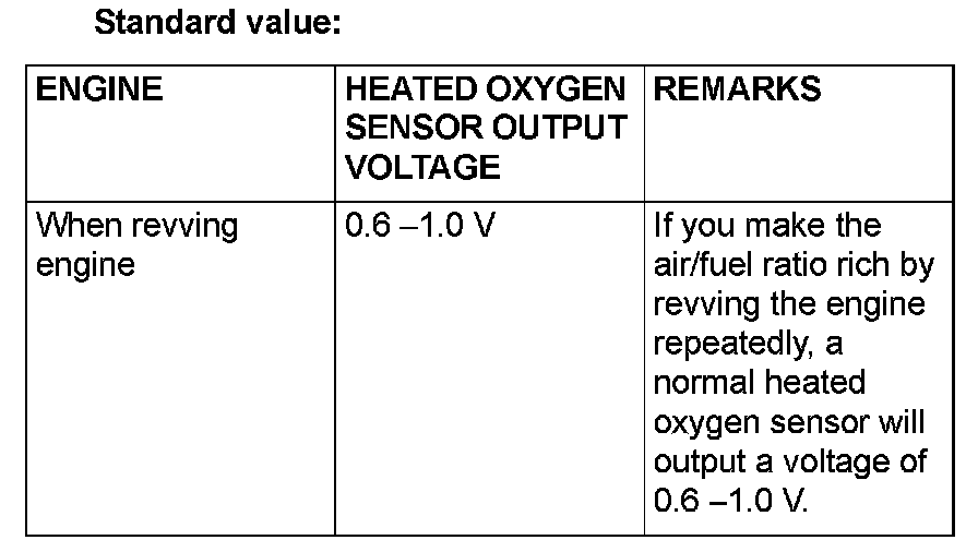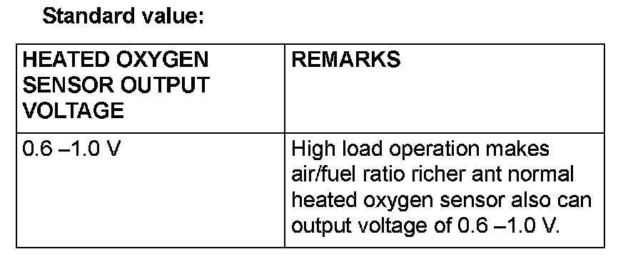 - If the sufficiently high temperature [of approximately 400 °C (752 °F) or more] is not reached although the heated oxygen sensor is normal, the output voltage would be possibly low although the rich air/fuel ratio.