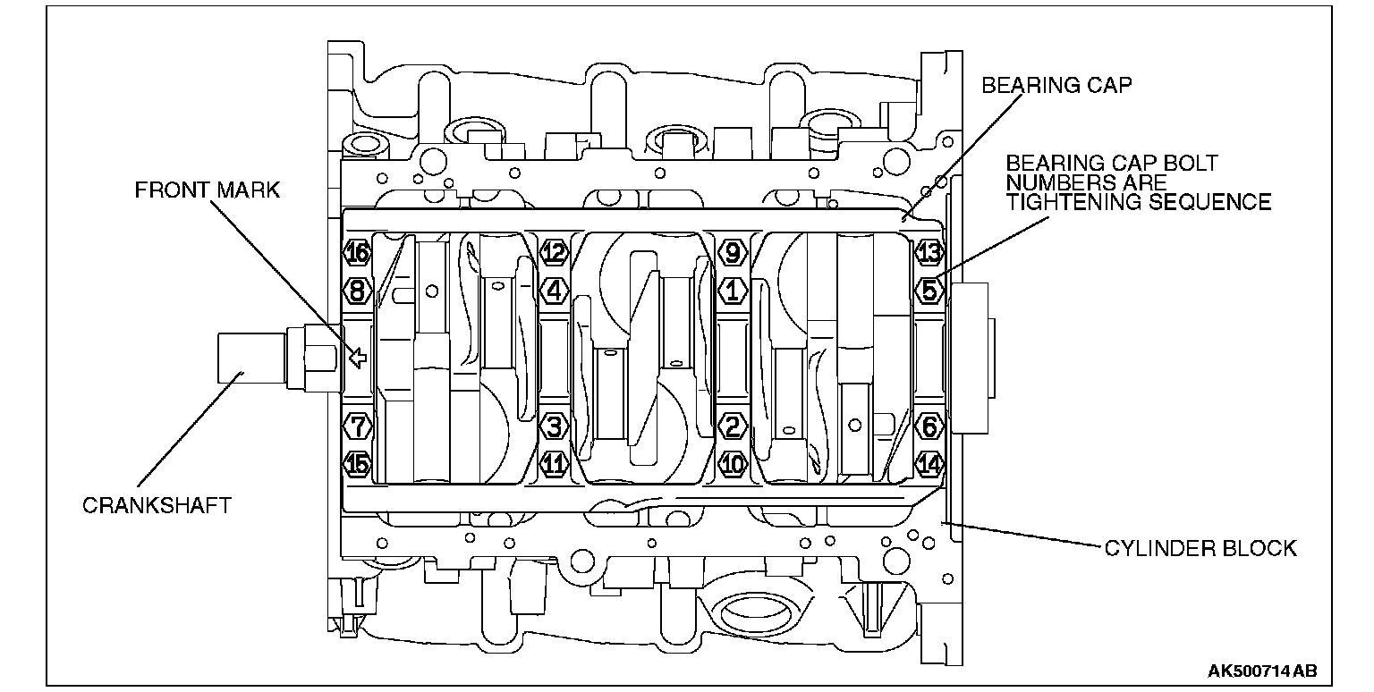 Tighten the bearing cap bolts to specified torque in the sequence shown in the illustration.