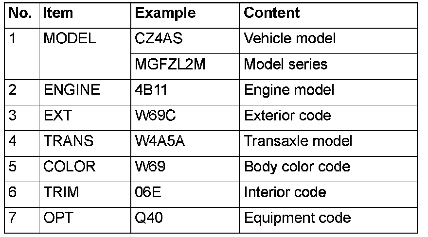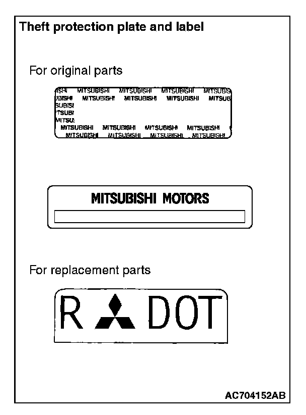 In order to protect against theft, a Vehicle Identification Number (VIN) is attached as a plate or label to the following major parts of the engine, transaxle and main outer panels: Engine cylinder block, Transaxle housing, Front fender, Hood, Trunk lid, Bumpers, Side outer panel, Doors. In addition, a theft-protection label is attached to replacement parts for main outer panels. The same data is stamped into replacement parts for the engine and the transaxle.