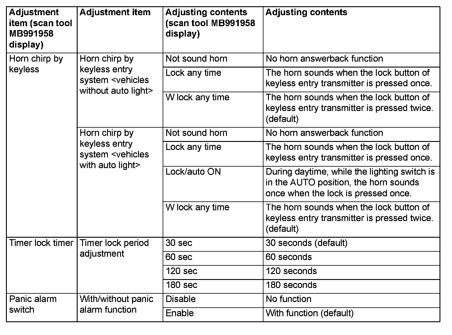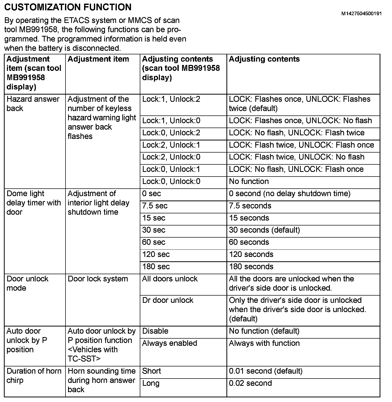 By operating the ETACS system or MMCS of scan tool MB991958, the following functions can be programmed. The programmed information is held even when the battery is disconnected.