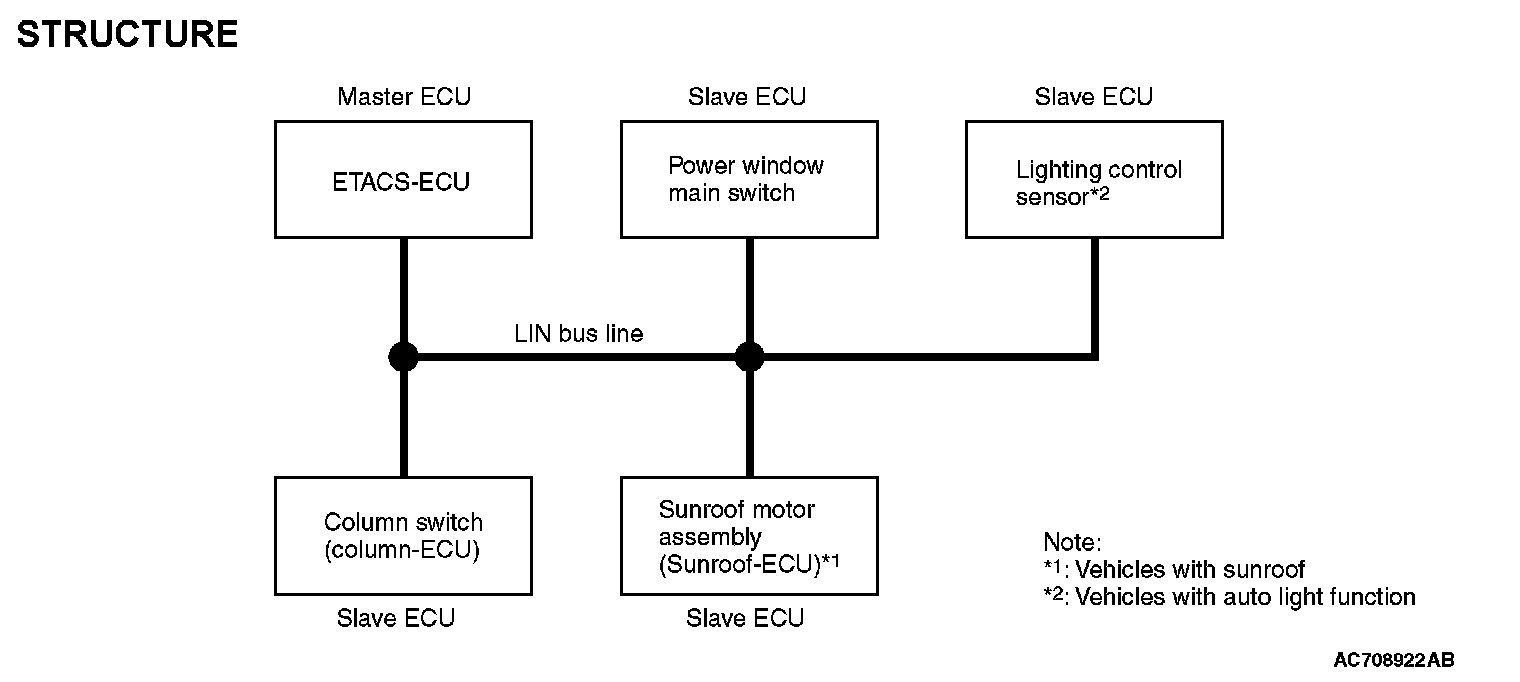 Master and slave ECUs are connected to the LIN bus lines. The master ECU is the ETACS*1-ECU, and the slave ECUs are the column switch (column-ECU), the power window main switch, the sunroof-ECU*2 and the lighting control sensor*3. The master ECU requests these slave ECUs to communicate each other via communication lines.