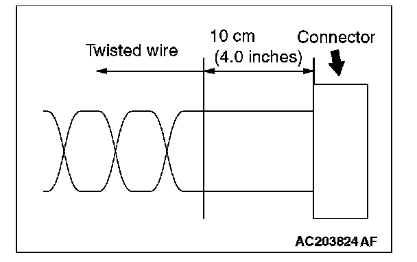 - If the connector or wire on the main bus line or the sub-bus wire is replaced, the frayed end of the twisted wire should be within 10 cm (4 inches) from the connector. If it exceeds 10 cm (4 inches), twist the wiring harness just like the original twisted wire. If the frayed end exceeds 10 cm (4 inches), noise suppression is deteriorated, causing a communication error.
