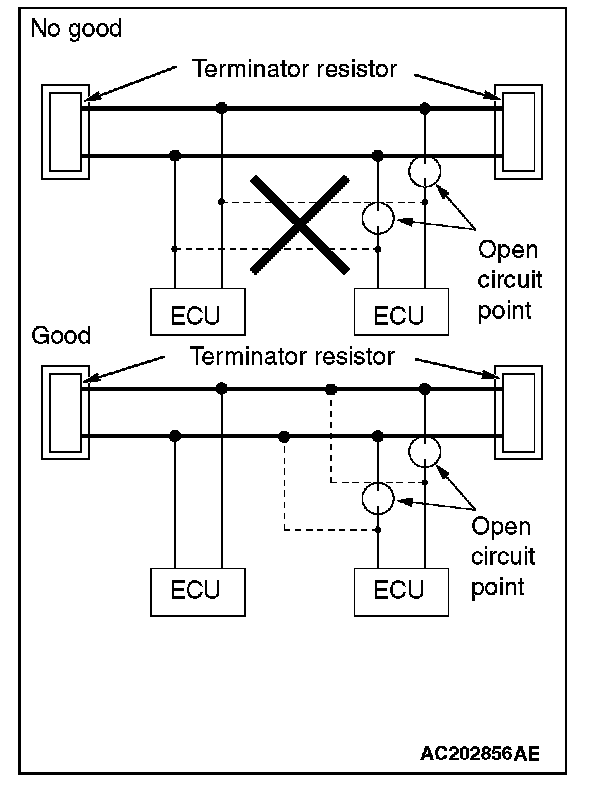 If one-side terminator resistor is broken, the CAN communication will continue although noise suppression is deteriorated. No diagnostic trouble code may be set even if the terminator resistor was broken. If a damage is found, replace the ECU which incorporates the defective terminator resistor.