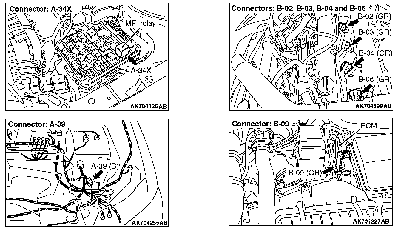 STEP 8. Check for harness damage between MFI relay connector A-34X (terminal No. 2) and ignition coil connector B-02, B-03, B-04 and B-06 (terminal No. 4)
