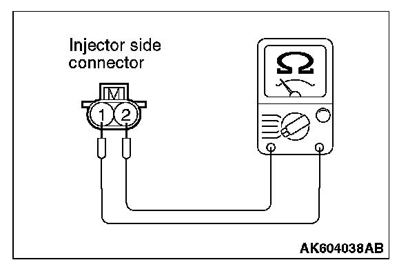 2. Measure the resistance between injector side connector terminal No. 1 and No. 2.