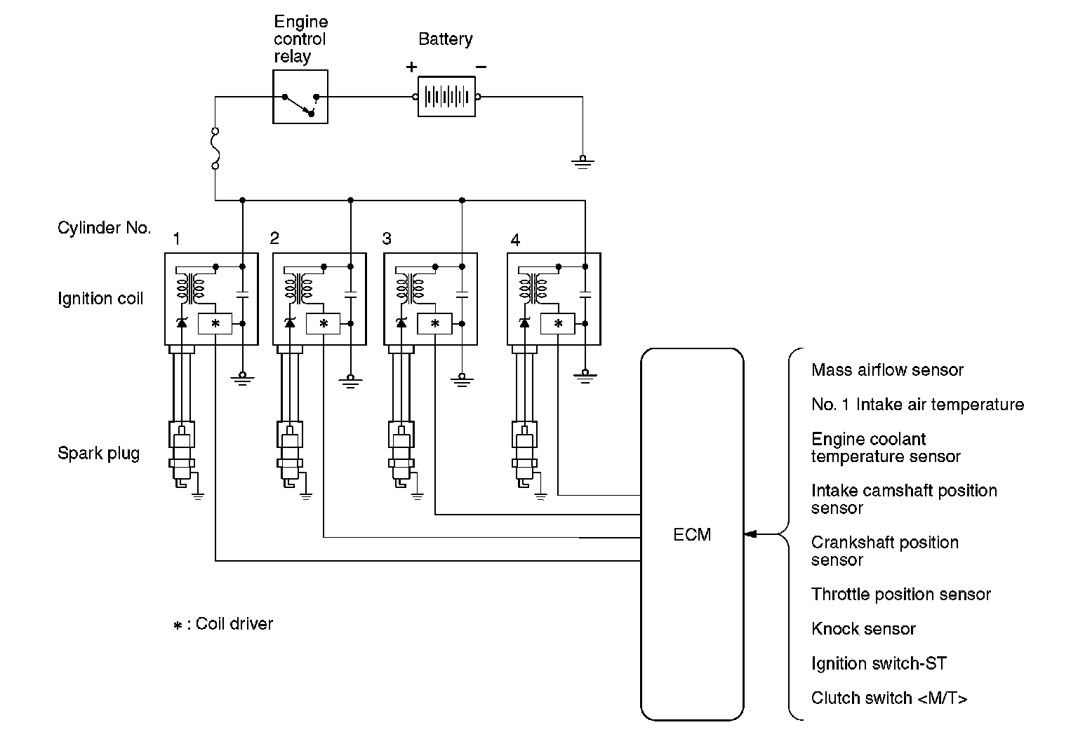 The ECM determines which ignition coil should be controlled by means of the signals from the camshaft position sensor and the crank angle sensor. It also detects the crankshaft position, in order to provide ignition at the most appropriate timing in response to the engine operation conditions.