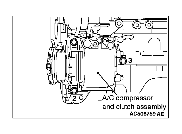 Tighten A/C compressor and clutch assembly mounting bolts to the specified torque in the order of number shown in the illustration.