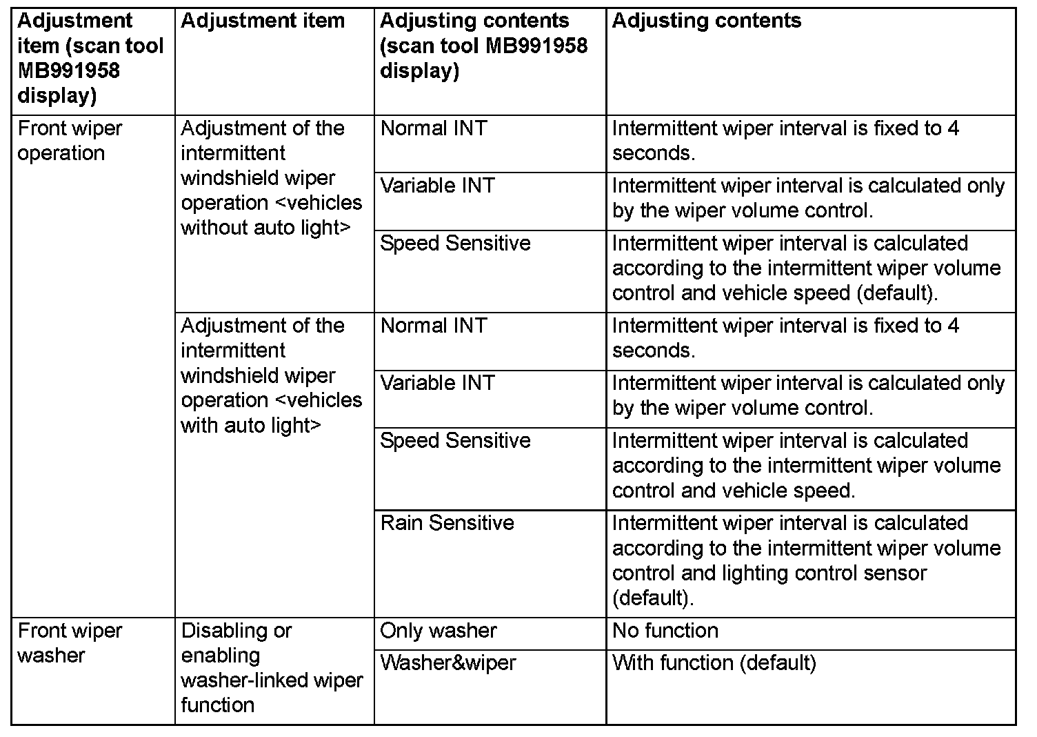 Using the ETACS system of scan tool MB991958, the following functions can be programmed. The programmed information is held even when the battery is disconnected.