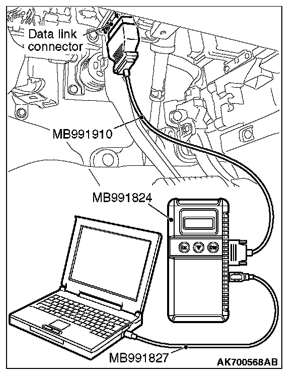 CAUTION: To prevent damage to scan tool MB991958, always turn the ignition switch to the "LOCK" (OFF) position before connecting or disconnecting scan tool MB991958.