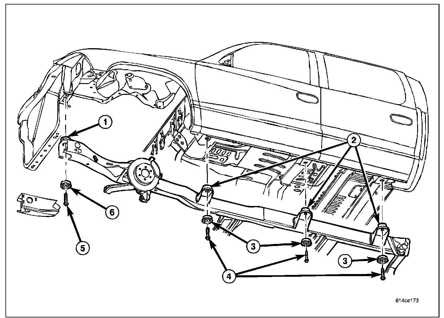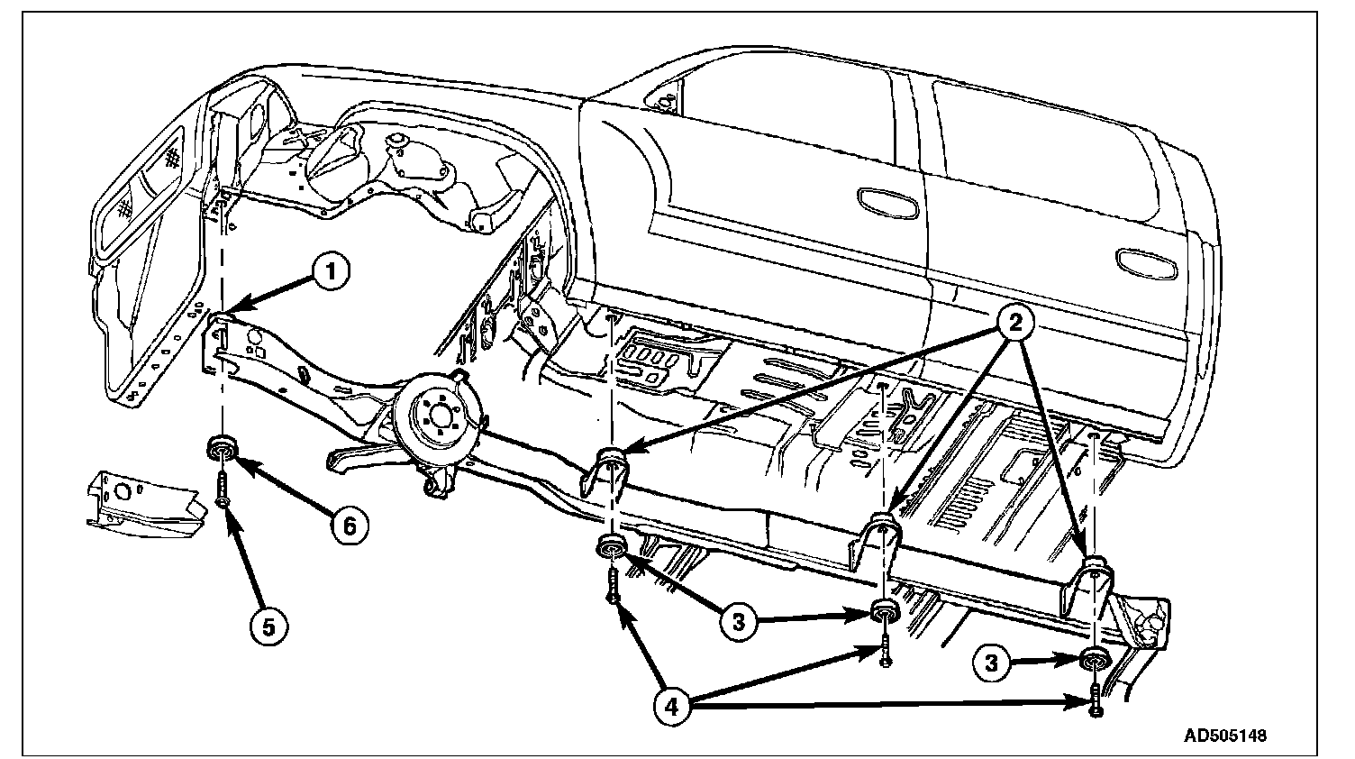 2. Install the front end sheet metal mounting isolators (1 & 6) and install the bolt (5).