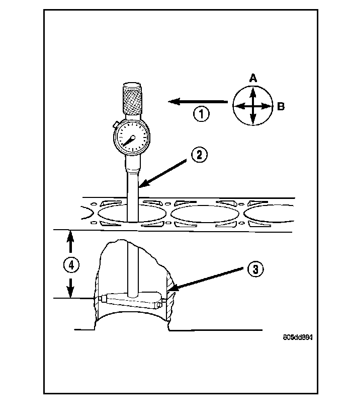 2. Measure the inside diameter of the cylinder bore at a point 38.0 mm (1.5 inches) below top of bore (4). Start perpendicular (across or at 90°) to the axis of the crankshaft at point A and then take an additional bore reading 90° to that at point B.