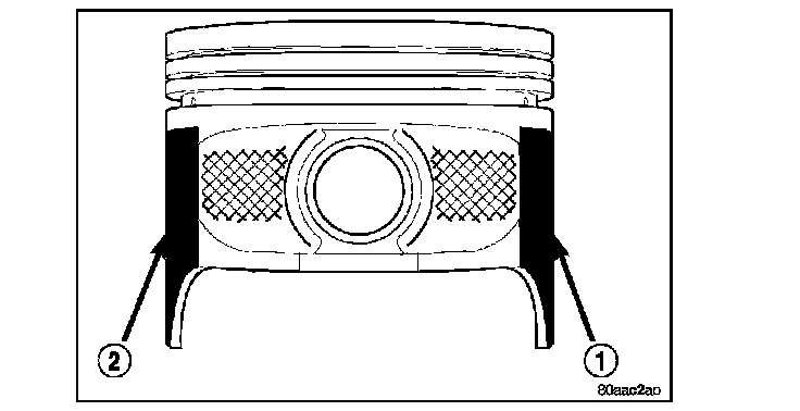 4. The coating material (1) and (2) is applied to the piston after the final piston machining process. Measuring the outside diameter of a coated piston will not provide accurate results. Therefore measuring the inside diameter of the cylinder bore with a dial Bore Gauge is MANDATORY. To correctly select the proper size piston, a cylinder bore gauge capable of reading in 0.003 mm (0.0001 in.) increments is required.