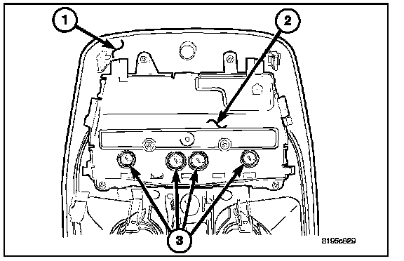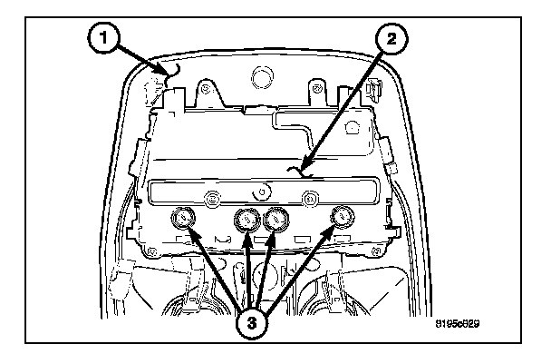 NOTE: There are provisions for up to four bulb/bulb holder units on the Compass Mini-Trip Computer (CMTC) circuit board. The two outboard bulbs illuminate the CMTC push buttons, while the two center bulbs illuminate the optional universal transmitter push buttons. Therefore, the center bulb locations are only populated on vehicles equipped with the optional universal transmitter.