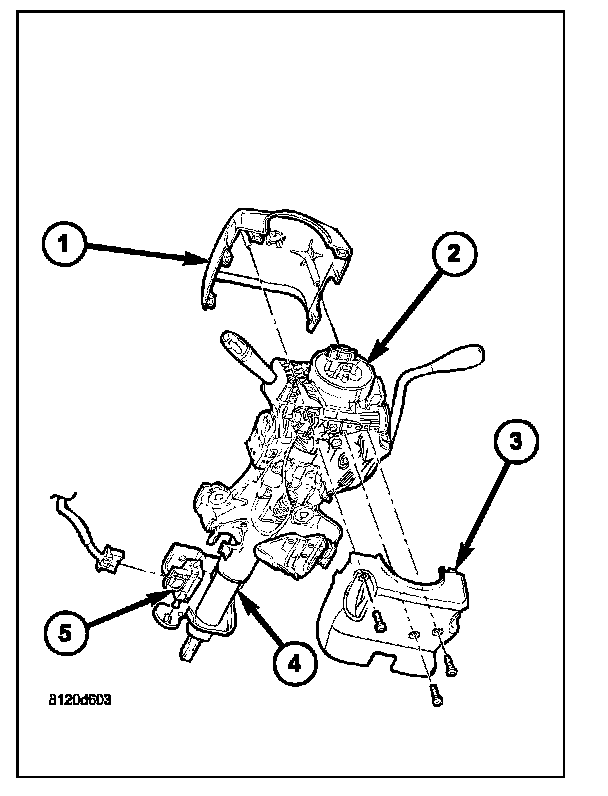 9. Remove the one center screw that secures the lower shroud to the steering column (4).