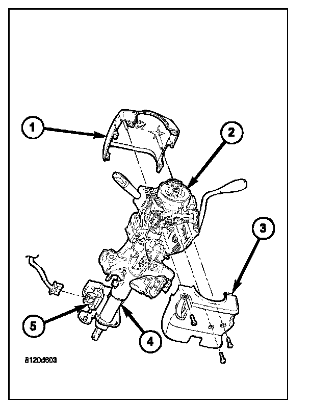 6. Position the upper shroud (1) onto the steering column over the lower shroud. On vehicles equipped with an automatic transmission, be certain to engage the gearshift lever gap hider into the opening in the right side of both shroud halves.