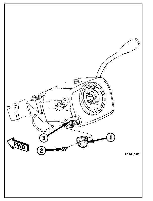 1. Slide the multi-function switch (1) into the multi-function switch mounting housing (3) from the left side. Be certain that the alignment pins on the top and bottom of the switch are properly engaged in the channels of the mounting housing.