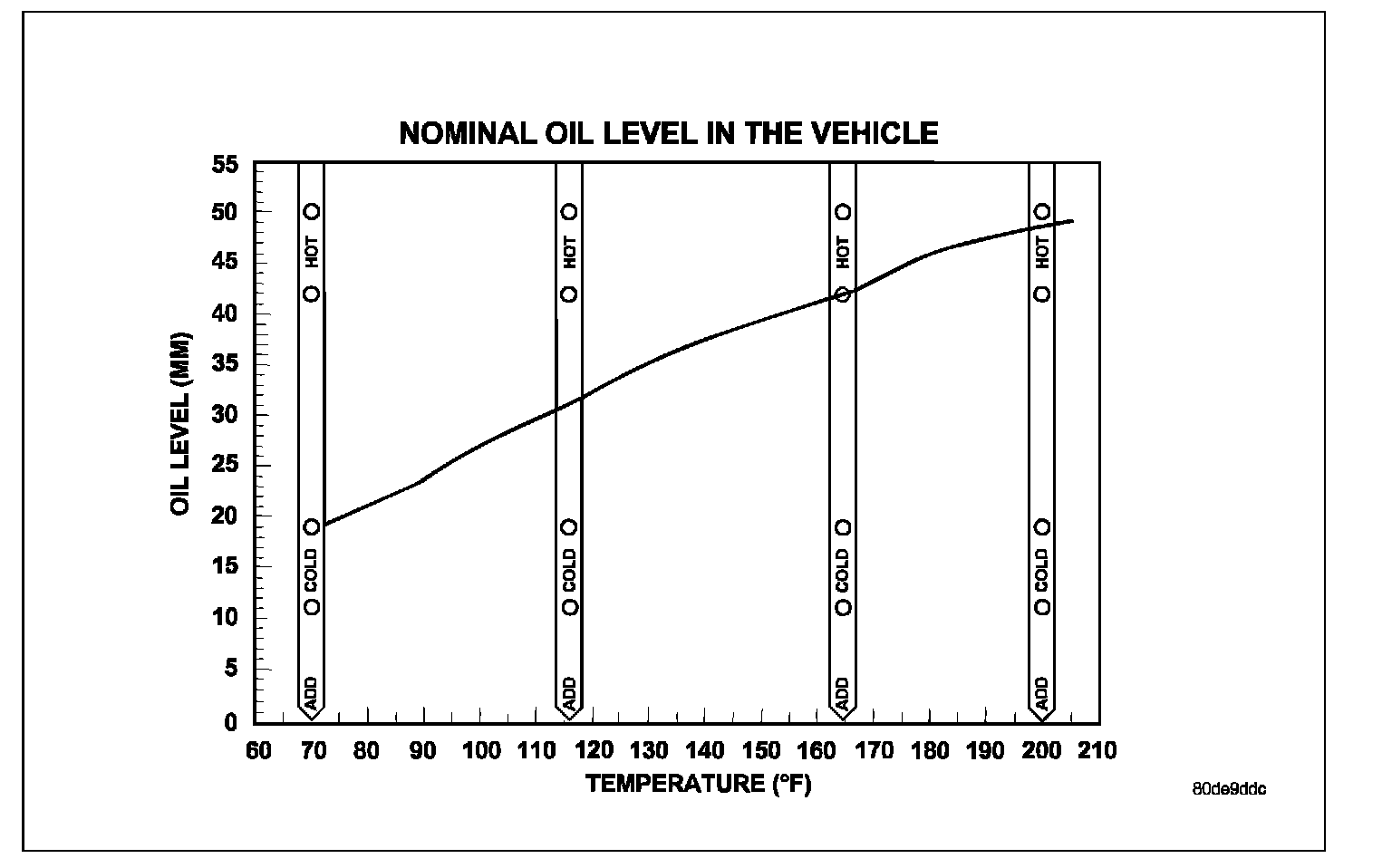 7. The transmission Oil Dipstick 9336 has indicator marks every 10mm. Determine the height of the oil level on the dipstick and using the height, the transmission temperature, and the Transmission Fluid Graph, determine if the transmission oil level is correct.