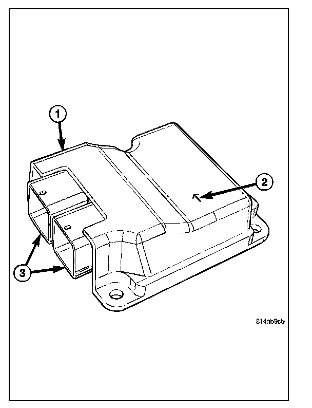 An arrow (2) printed on the label on the top of the ORC housing provides a visual verification of the proper orientation of the unit, and should always be pointed toward the front of the vehicle. The ORC housing has three integral flanges with mounting holes. Two are on the corners oriented towards the rear of the vehicle, and one is near the center of the side facing the front of the vehicle. A molded plastic electrical connector (3) with two receptacles, each containing up to 32 terminal pins, exits the left facing side of the ORC housing. These terminal pins connect the ORC to the vehicle electrical system through two dedicated take outs and connectors, one each from the instrument panel and the body wire harnesses.