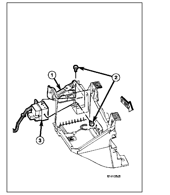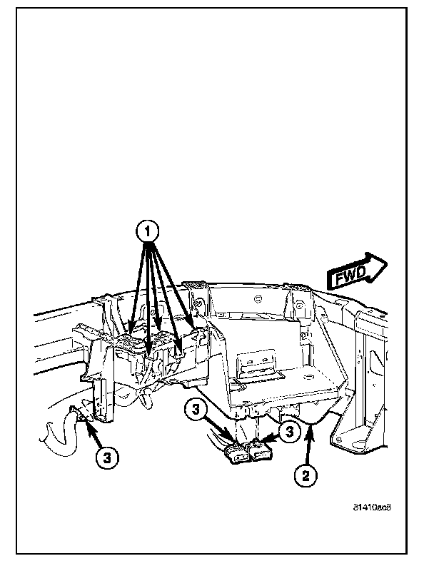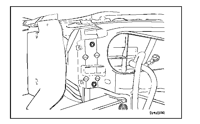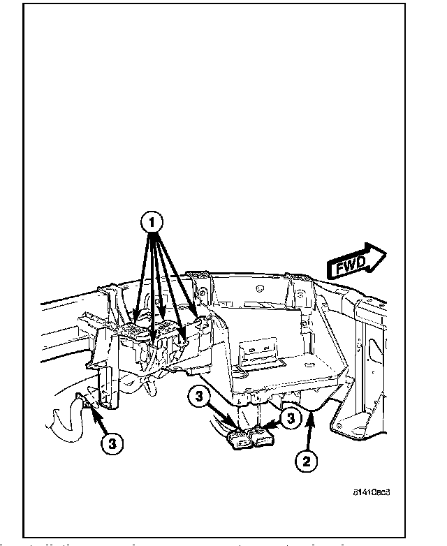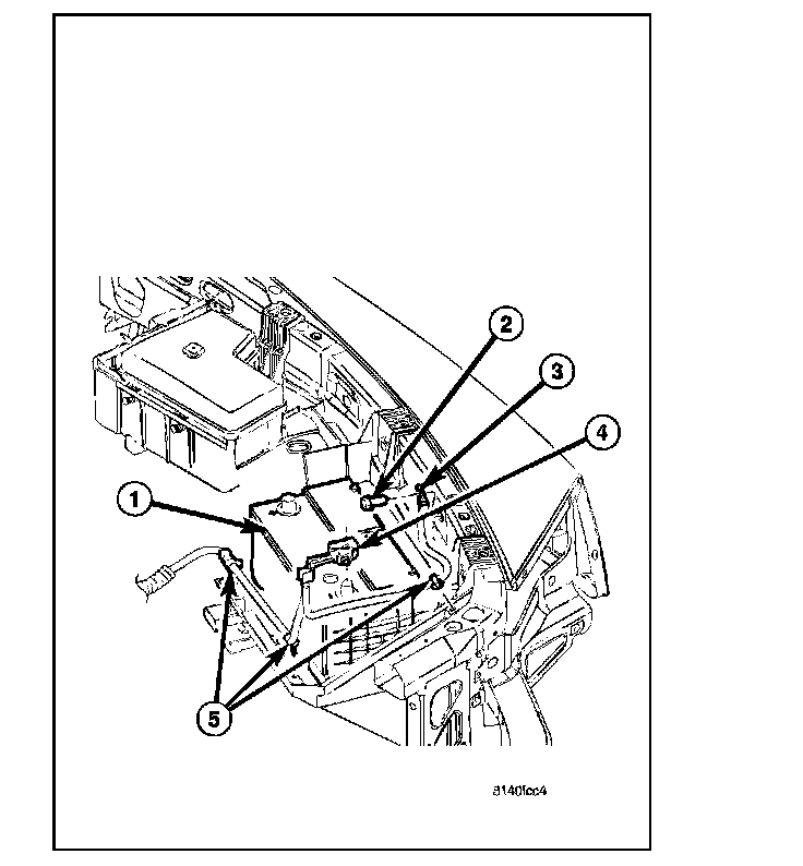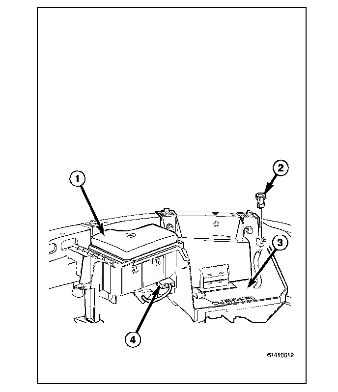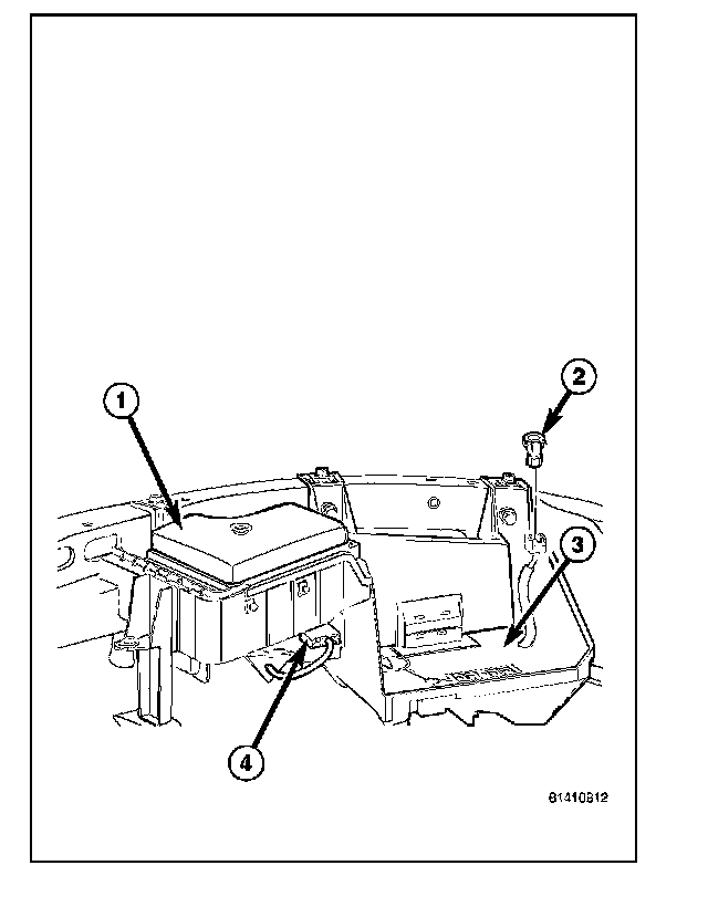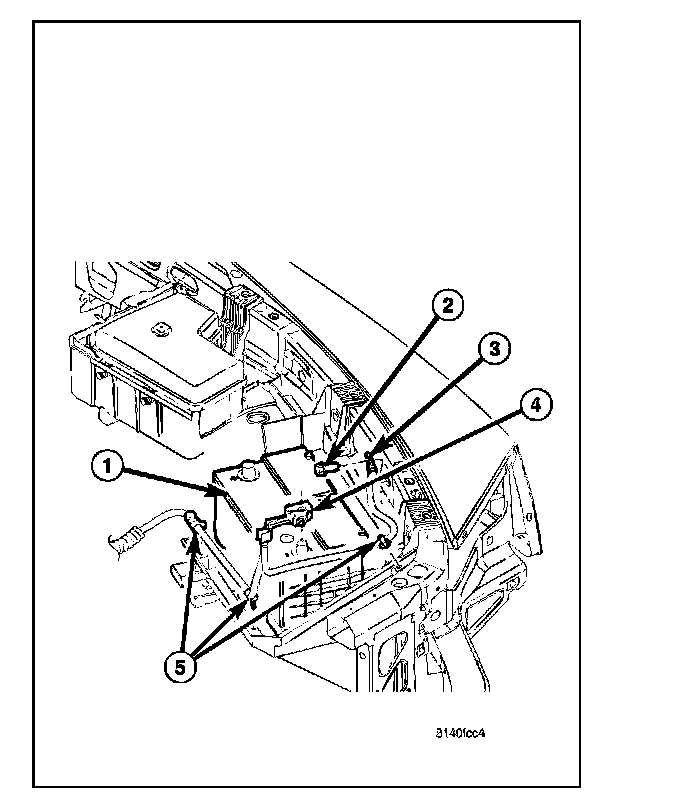 The molded plastic battery tray (3) is located in the left front corner of the engine compartment. On this vehicle, the battery tray also provides an anchor point for the anti-lock brake controller (4) and the Integrated Power Module (IPM) (1). The battery hold down hardware is contained within the battery tray.