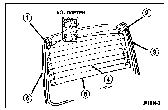 4. If broken defogger grid lines or bus bars are suspected, use a 12-volt DC voltmeter and contact terminal A with the negative lead and each rear glass heating grid line at its mid-point C (4) with the positive lead. The voltmeter should read approximately 6 volts at each grid line midpoint. If the voltmeter does not read approximately 6 volts, repair the open grid line(s) or bus bar(s).